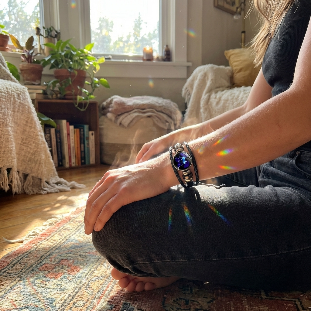 Le bracelet diffuse ses fréquences vibratoires directement via les points de pulsation du poignet, un canal qui permet une imprégnation énergétique fluide (contrairement aux méthodes mentales lentes).